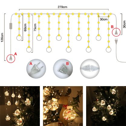 Красива завеса от искрящи топки с коледни мотиви.